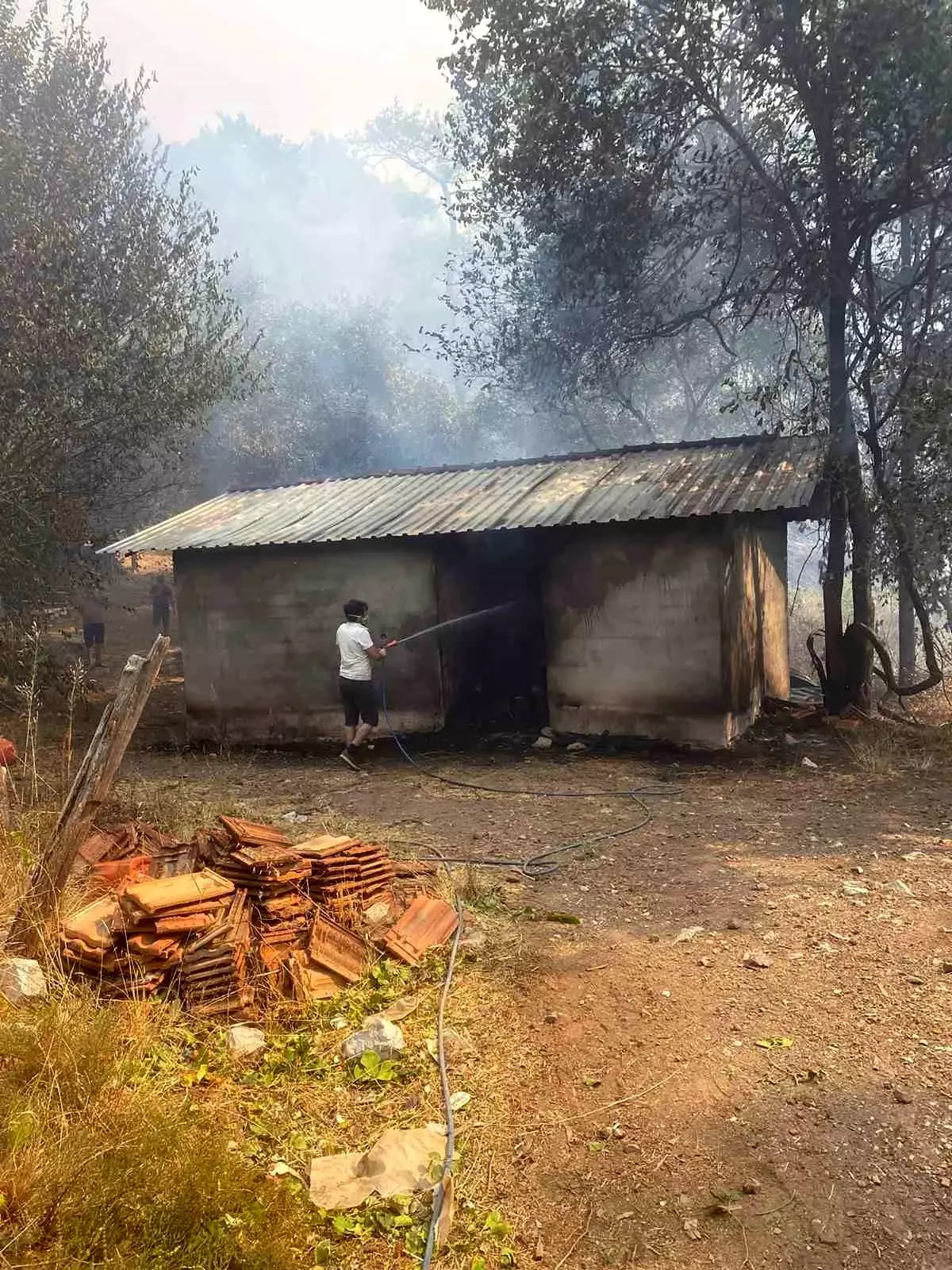 Bölgede depo olarak kullanılan binalara sıçrayan alevler bina içindeki gereçleri büsbütün yakarken, grupların karadan ve havadan müdahalesi devam ediyor. – MUĞLA